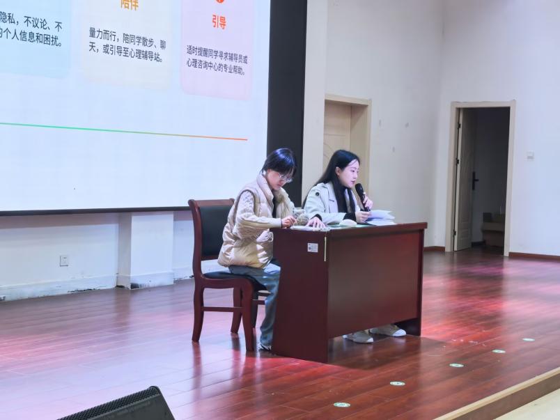 会上,两位老师强调了学生心理干部的主要工作职责,从日常防范、科学关心、紧急处置三方面讲解了工作方法,并通过真实案例梳理了心理危机的标准化应对流程。同时,对本学期的心理健康工作进行了讲解,引导同学们积极参与校园心理活动。
