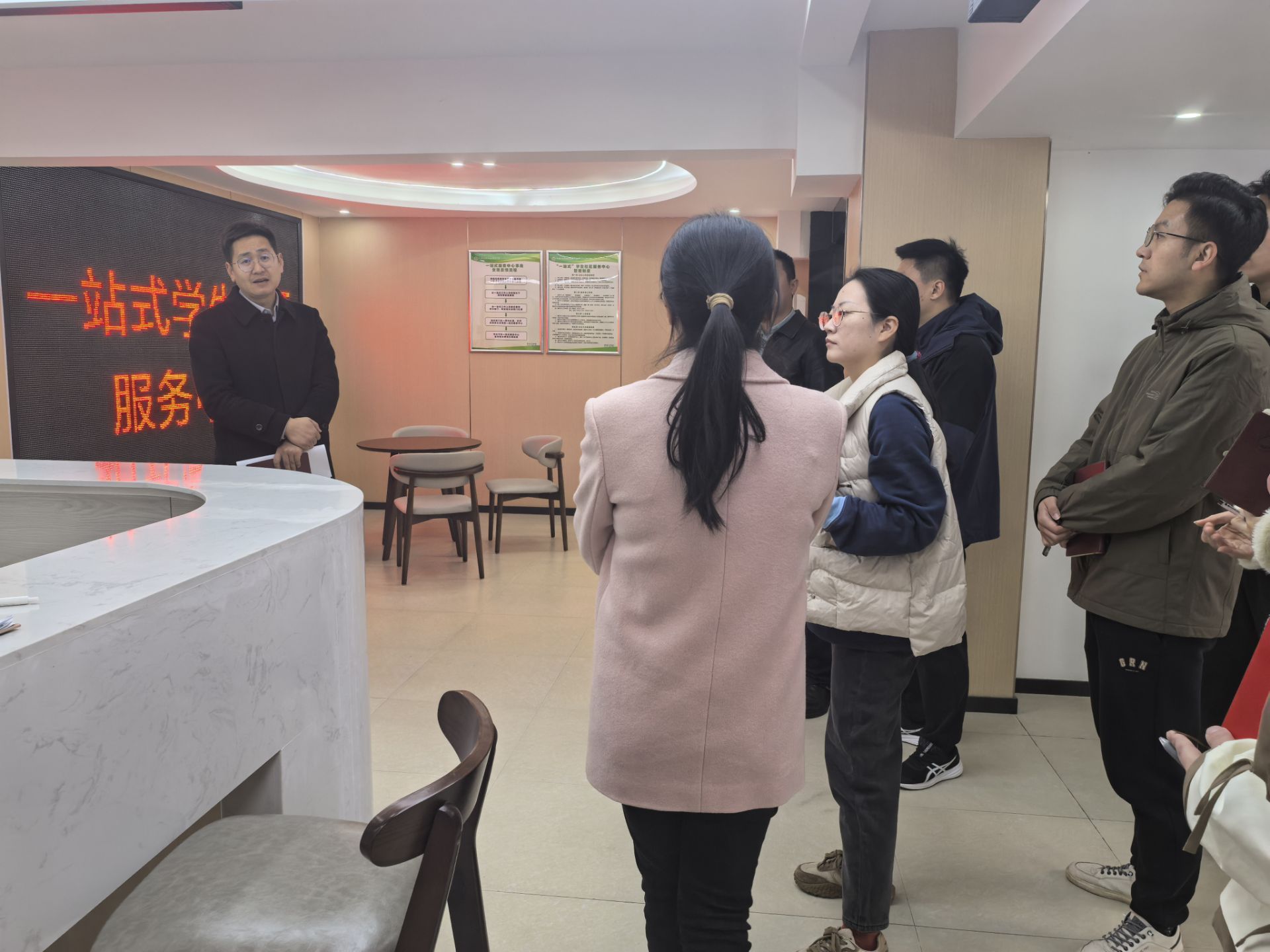 活动伊始,支部书记罗卫兵带领全体参会成员前往一站式学生服务中心进行了实地察看,并要求全体党员同志要始终牢记为人民服务的根本宗旨,鼓励大家积极走进学生中去,了解他们的实际需求,解决他们面临的困难。此次下基层活动不仅增进了党员们对一线工作的认识,也为后续的学习研讨奠定了坚实的基础。