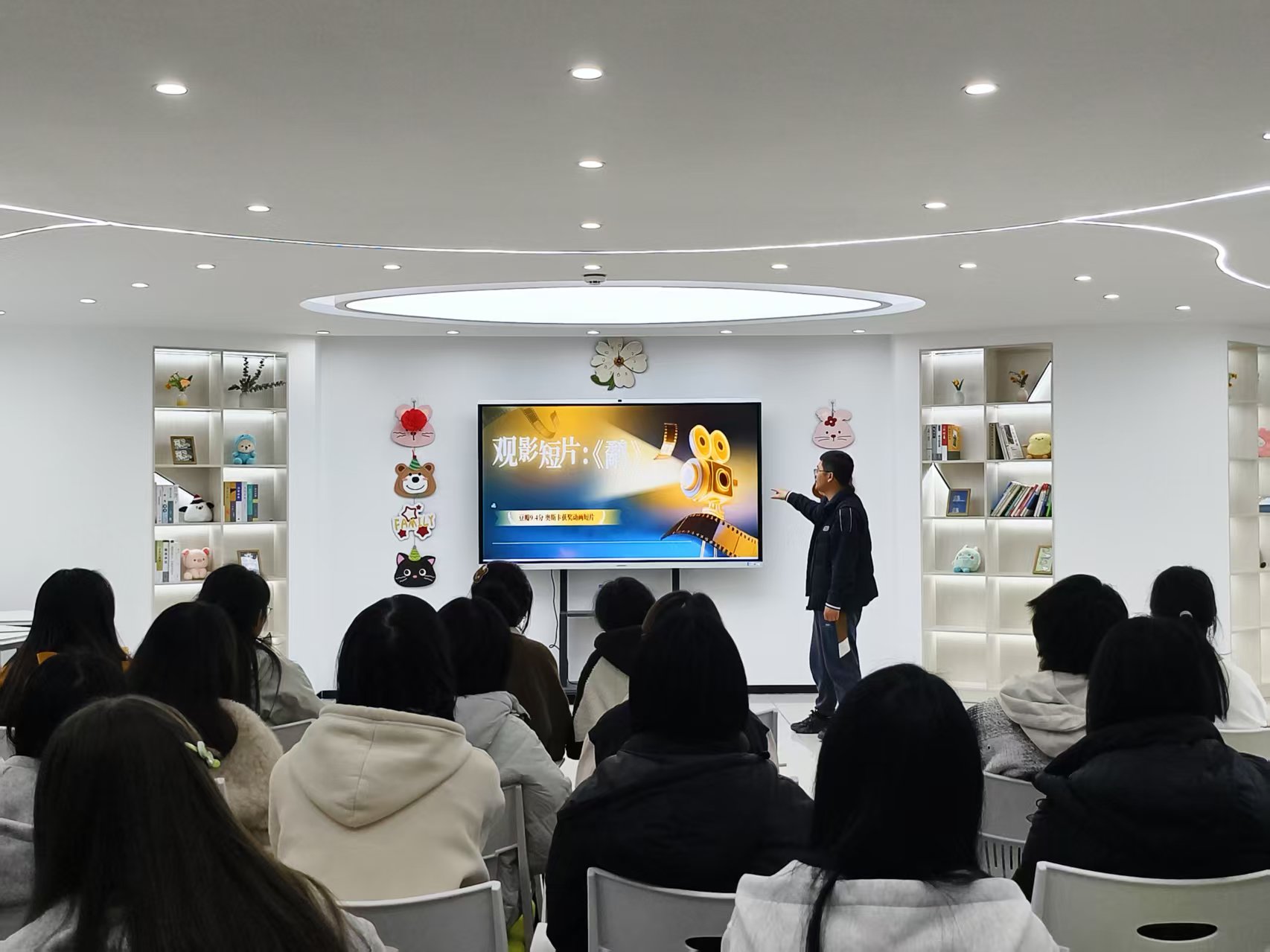 暖场结束后,进入核心观影环节。本次选取短片《鹬》,短片虽短却蕴含深刻哲理,凭借细腻唯美的画面与温暖治愈的剧情,引导学生思索成长路上的挫折与勇气。观影时,同学们全神贯注,随剧情起伏感悟成长力量。